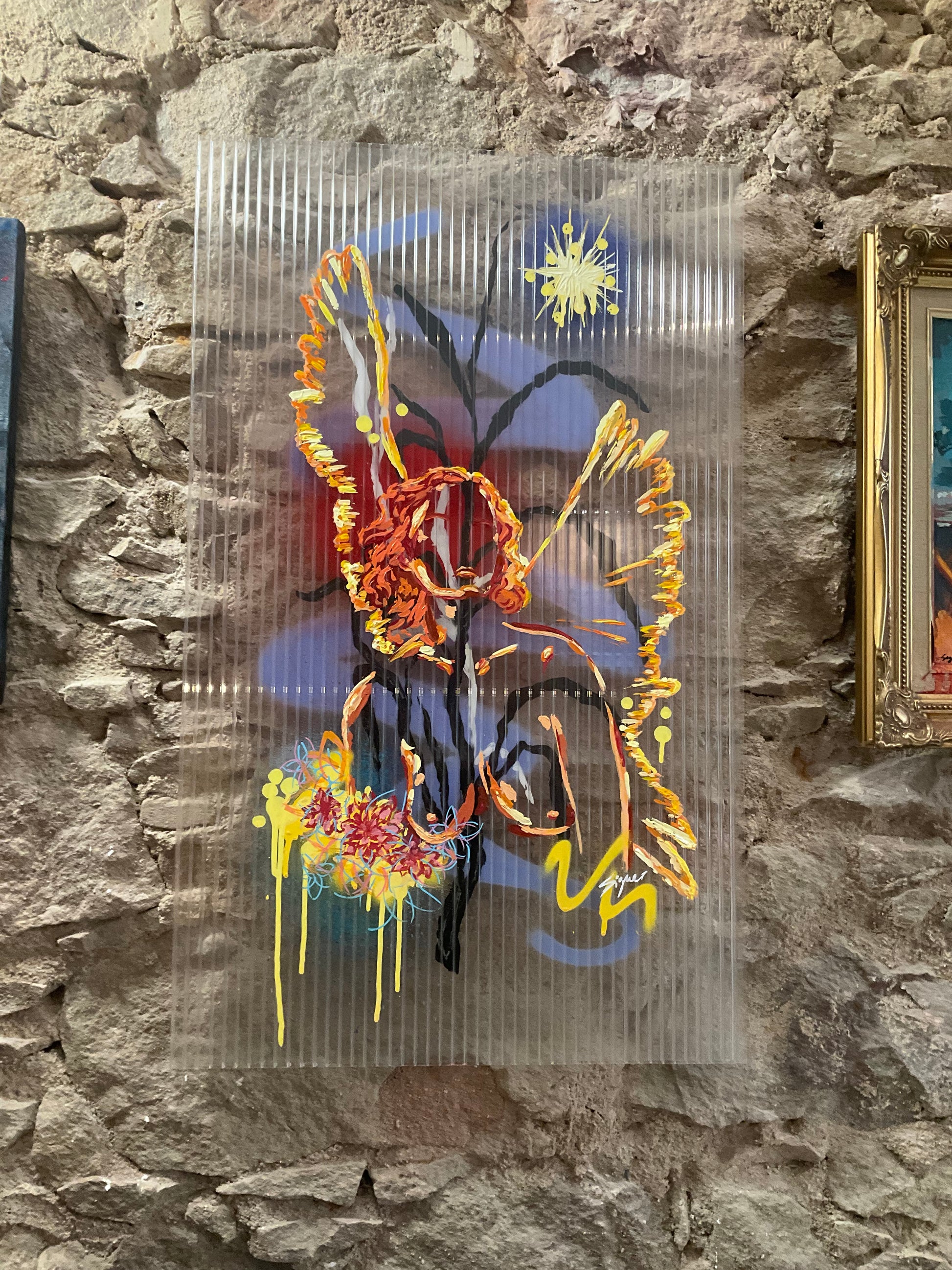 Mixed media; acrylics, spray paint and markers on recycled plastic panel
